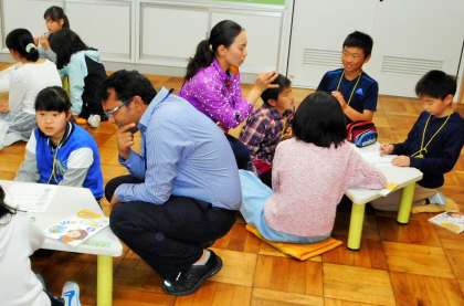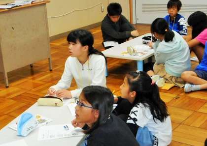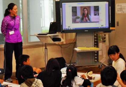 今日の学習は「自己紹介を聞こう」で、DVD画像による自己紹介から、聞き取ったことをワークシートにまとめます。グループで話合って、聞き取ったことをふくらめていきす。