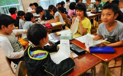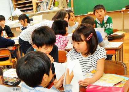 「春のしぜんにとびだそう」の学習で、「生き物発見カード」にまとめた内容について、グループで話合っている場面です。