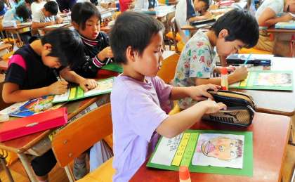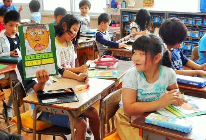 掲示用の自己紹介カードを作成していました。自画像、名前、誕生日、アピールポイントが書かれています。