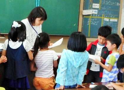 「1年となかよし」の学習で、学校のいろいろな場所(部屋)に関して、1年生が知りたいと考えている質問を話合っている場面です。グループごとに先生のアドバイスをもらいます。