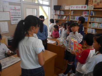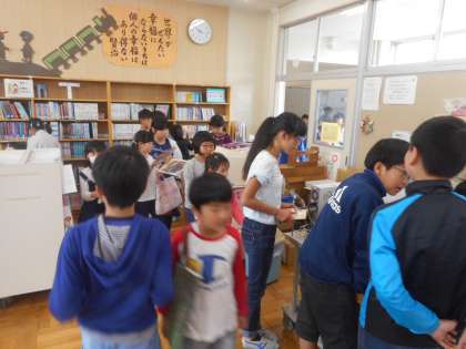 運動場がぬかるんで使えなかったため、サンタイムや昼休みの図書館は、今日もたくさんの子どもたちが、本を借りたり返したり、読書を楽しんだりするために来館していました。図書委員会の子どもたちも、大忙し。はりきって活動し、大活躍でした。
