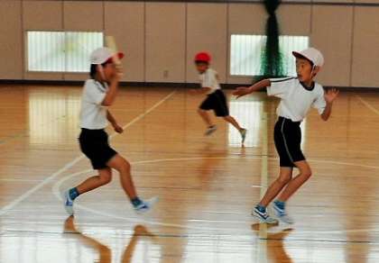 体育館で、リレーのバトンパスの練習をしていました。リードの取り方が少しずつ分かってきている子供たちです。