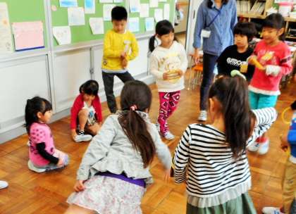 「10までのかず」の学習で、2つのグループに分かれて輪投げをやっている場面です。入った輪の数をもとにして、学習を進めます。