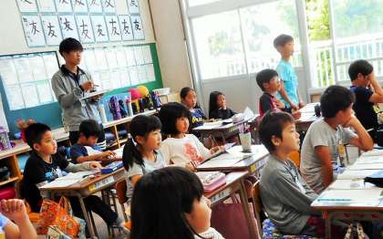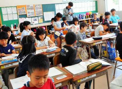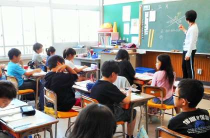 教育実習生の二人目は、4年2組(渡邉学級)で3週間の実習を行う土屋亮太先生です。教室で算数の授業を参観している場面です。