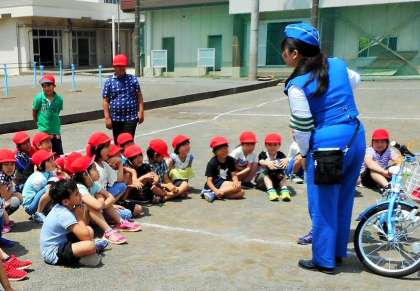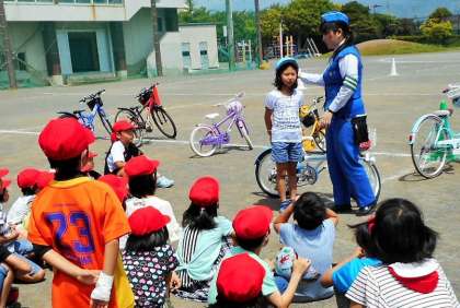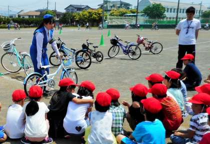 自転車に乗る前に、正しいヘルメットの付け方の指導をしていただいている場面です。