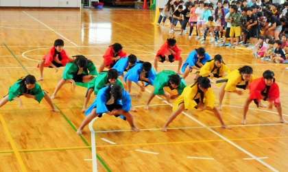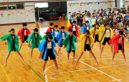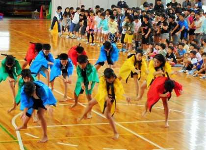 5年生は、4年生に続けて昨年の運動会で踊った「ソーラン節」を紹介してくれました。4色の衣装が鮮やかです。