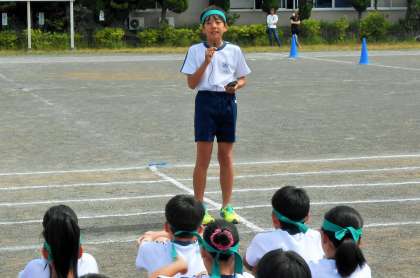 はじめは、開会式での「めあての発表(1年生)」と準備体操をやっている場面です。