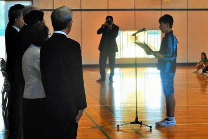 式の中で市民憲章を全校で唱和してる場面と、代表児童あいさつの場面です。