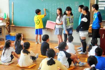 ファミリーグループごとに集まり、6年生が中心となって話し合いを進めていました。