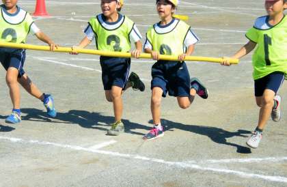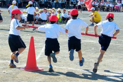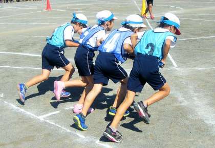 午後のプログラム3番 3年の団体競技「それいけ! ブンブンタイフーン」の競技の様子です。