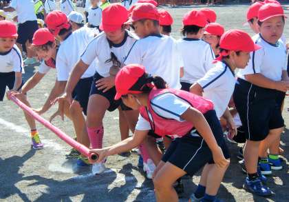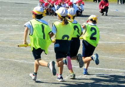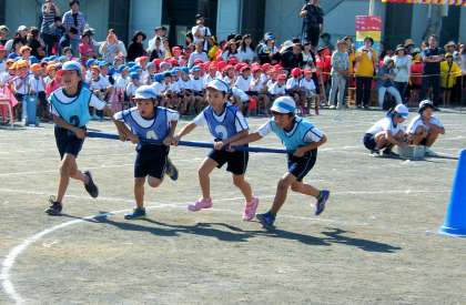 午後のプログラム3番 3年の団体競技「それいけ! ブンブンタイフーン」の競技の様子 その2です。
