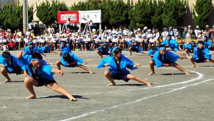 午後のプログラム4番 4年表現「全力 どっこいソーラン!!」の演技の様子です。