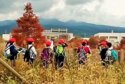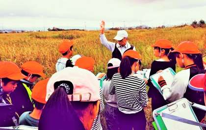 ボランティアガイドの方から、浮島沼に生息する水鳥(野鳥)についての説明を受けている場面です。