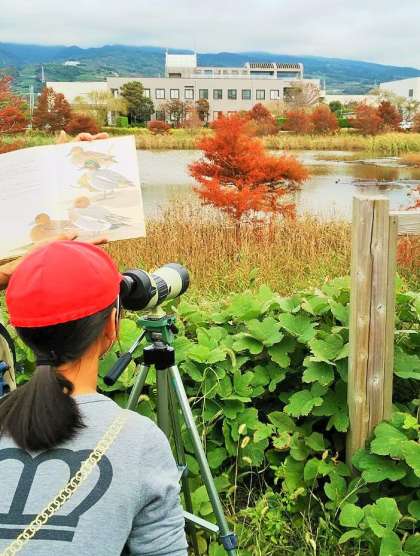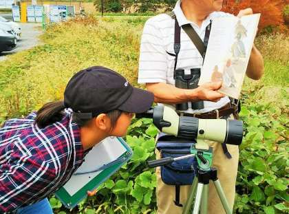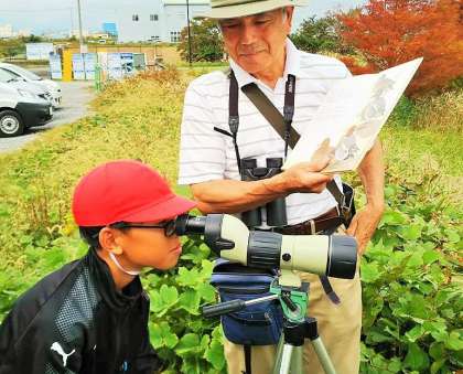 望遠鏡を使って野鳥の観察をしている子供たちの様子です。