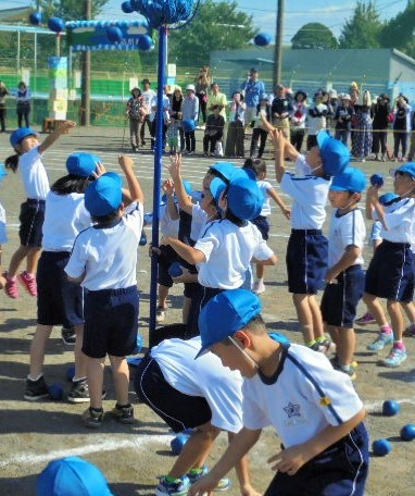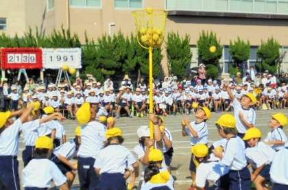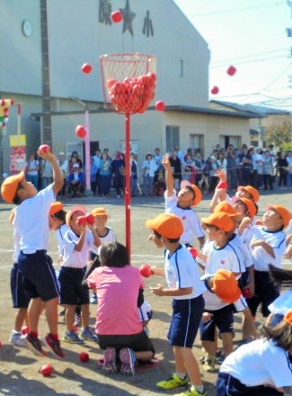 午後のプログラム5番 1年団体競技「なかよしだま いっぱいに なあれ」の競技の様子 その2です。