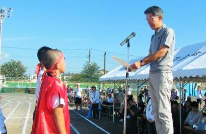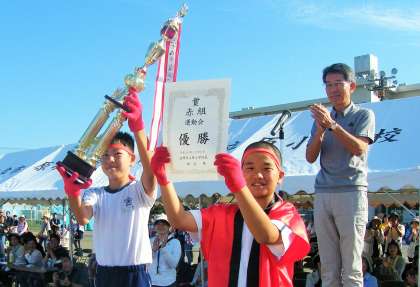 優勝した赤組の応援団長には賞状が、副団長にはトロフィーが、校長先生から渡されました。「赤組 優勝おめでとう!!」