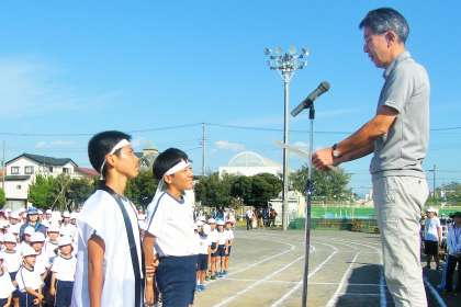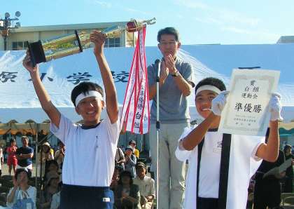 準優勝の白組の応援団長に賞状が、副団長にはトロフィーが、校長先生から渡されました。「白組 よくがんばりました!!」