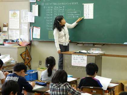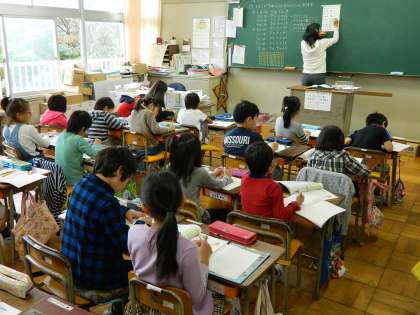 2年生の算数では、かけ算の学習の真っ最中です。計算の工夫をして答えを導き出したり、言い方を学んだりしていました。七の段では、口を大きく開けてはっきりと発音できるように繰り返し練習していました。