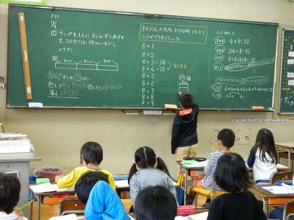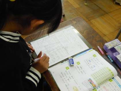 友達の計算の工夫を参考にして、かけ算の式と答えをノートに整理していました。