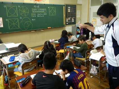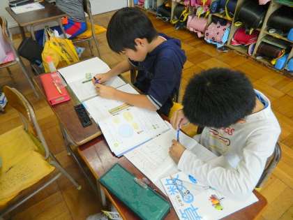 3年生は、コンパスを使った学習をしていました。先生が黒板に示した図形を自分の手でかき上げます。何度もやり直しながら、粘り強くコンパスを動かしていました。