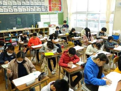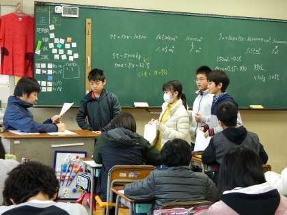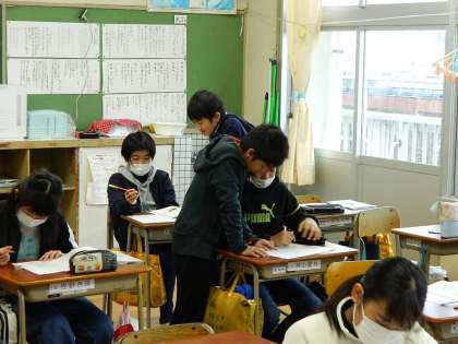 6年生の算数です。学習のまとめを進めています。解いたらすぐに答えの確認をし、分からない時には、自由に仲間と相談できます。自分の理解度を自ら確かめ、必要と思われる復習や練習をする。中学校に進学すると、より一層このような力が大切になります。