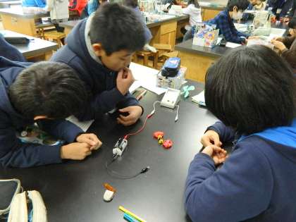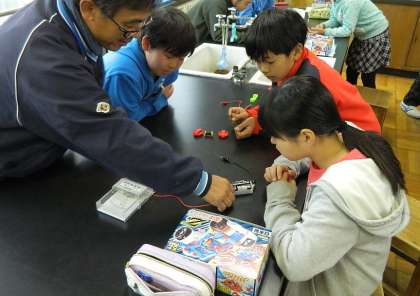 5年生の理科の時間です。「電磁石から出る磁力を確かめよう」を課題とし、電流の流れる向きと電磁石の極との関係を、実験で確かめていました。