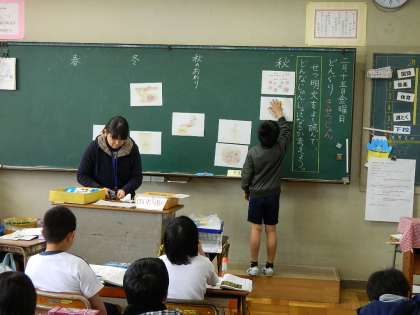 2年生の国語の時間です。説明的文章「どんぐり」を使い、挿絵を季節順に並べる学習をしていました。本文をよく読んで、一人一人が手元の挿絵に季節を書き込んでいます。その後、仲間と順序を確認していきました。
