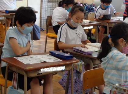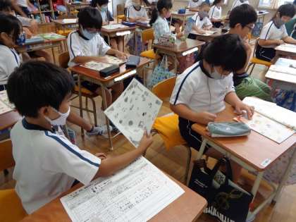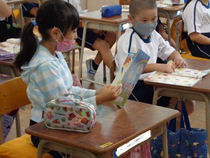 好きな物を伝え合うために、いろいろな言葉を英語で言えるように練習してました。友達が英語で言った言葉を聞き取り、そのものの絵を指さすポインティングゲームをしながら、言い方や発音の練習をしました。