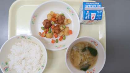 米飯 牛乳 鶏肉とじゃがいもの揚げ煮 ラビオリスープ