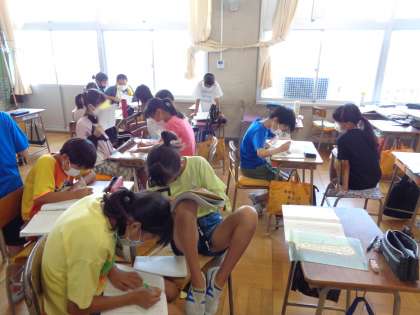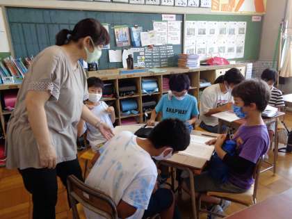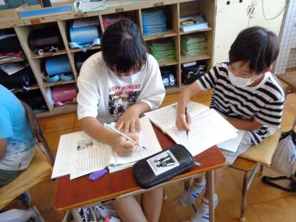 メディアの特徴を述べた説明文を読んでいます。友達と考えを交流しながら、新聞とインターネットの受信、発信の特徴を比較しています。