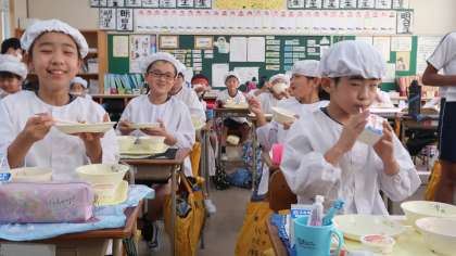4年生が給食を食べている様子と、りんごゼリーのおかわりじゃんけんです。