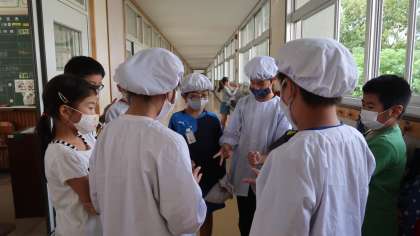 4年生が給食を食べている様子と、りんごゼリーのおかわりじゃんけんです。
