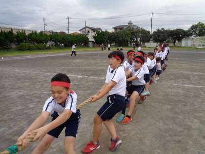 4年生の綱引きは、時間差で数人ずつダッシュして綱をつかみ、引っ張ります。最初のグループは仲間が増えるまで、こらえます。後からのグループは一刻も早く綱をつかむべく、猛ダッシュです。