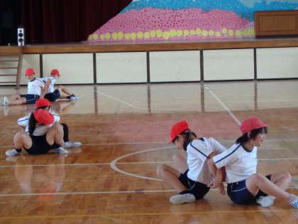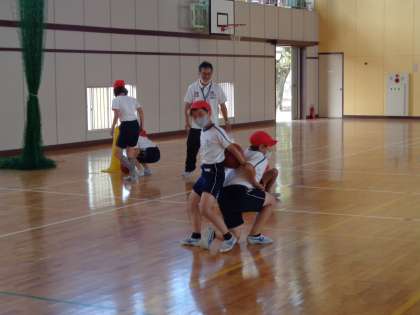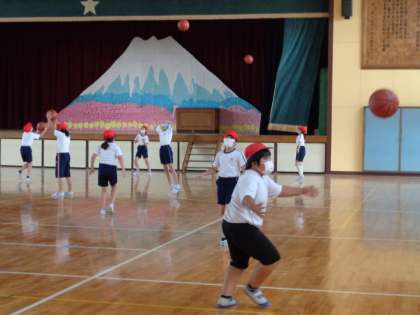 二人組でボールを使った運動をしています。相手がボールを高く投げたら一周回ってキャッチ。これがなかなか難しいようでした。