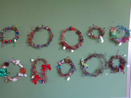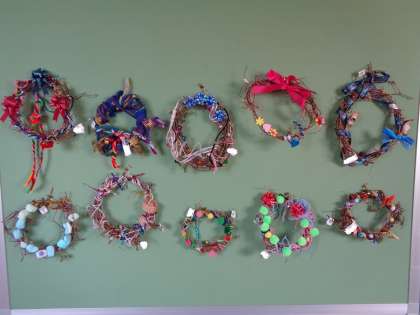 各クラスの廊下に子供たちが作ったアサガオリースが掲示されています。