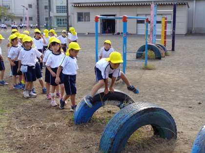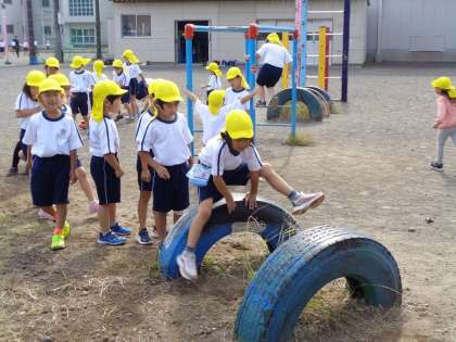 タイヤ跳びに挑戦です。「○○さん、さっきよりも上手だよ!」友達の跳び方をよく見ている発言に感心しました。