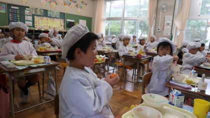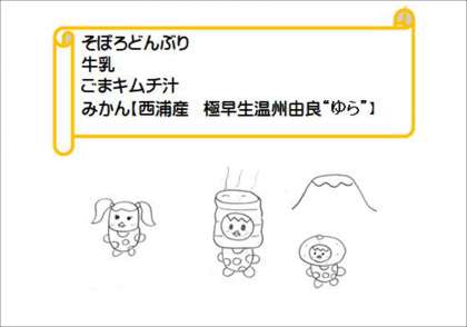 原ッピーは、5年生作。3枚目の写真は、1年生の給食時間です。西浦産由良みかんをおいしそうに食べていました。