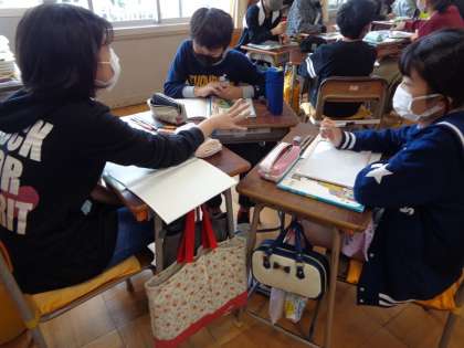 フレンチドレッシングの酢とサラダ油の量の関係を算数的に表すと・・・? 友達と頭を寄せ合って考えています。