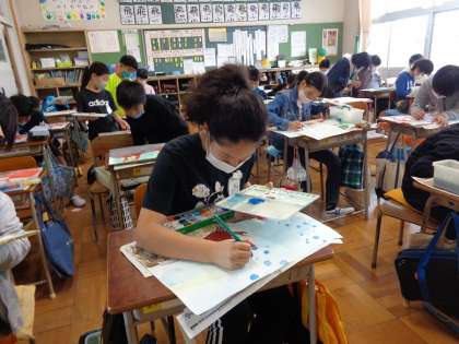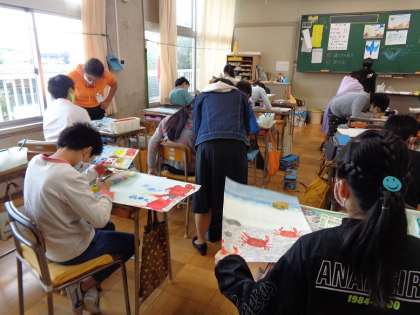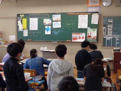 お話の絵が仕上がってきました。宮沢賢治作「やまなし」の世界を表現すべく、絵の具の使い方を工夫しています。自分の絵を黒板に貼って、遠くから眺めてさらに色を足したほうがよいところを見つけている子もいました。