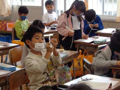 おもちゃの作り方の説明文を読みながら、実際に作ってみます。「はじめに」「つぎに」「それから」などという順序を表す言葉に注目しながら、手順を理解して作っていきます。
