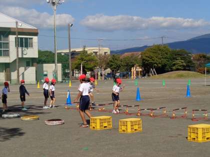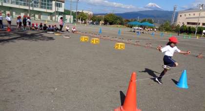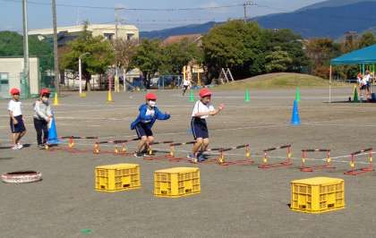 障害物を跳び越えて走ります。どんなふうに跳び越えたら速くなるかな?