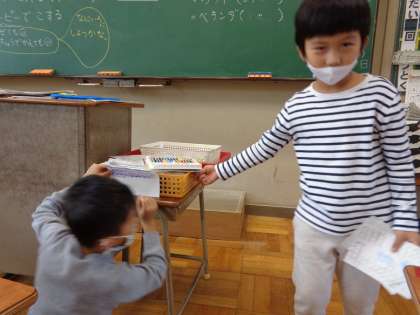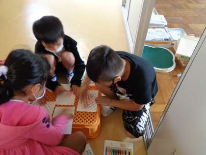 1年生の図工の時間です。ぼこぼこ、ざらざらしたものを見つけて、パスティックでこすり出しを楽しんでいました。