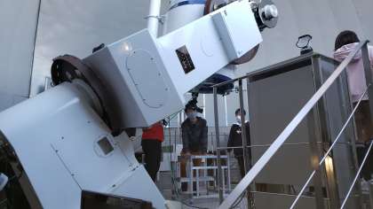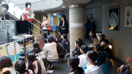 プラネタリウムの後は、天体望遠鏡で星を見せてもらったり、展示、体験室でメカメカ島の秘宝を探したりしています。