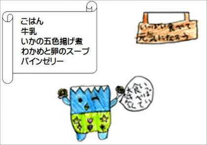 写真は、献立ボードの前の給食委員さん。手にしているのは、いか と 大豆 です。いかの五色揚げ煮には、大豆もたくさん入っていました。