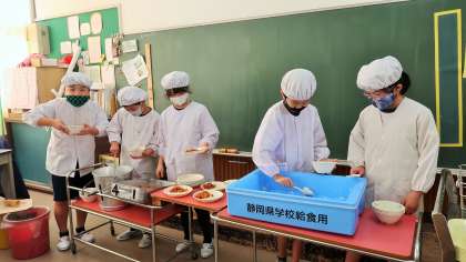 4年生の配膳、おかわりの様子です。大勢の子どもたちがおかわりに並んでいます。