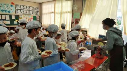 4年生の配膳、おかわりの様子です。大勢の子どもたちがおかわりに並んでいます。