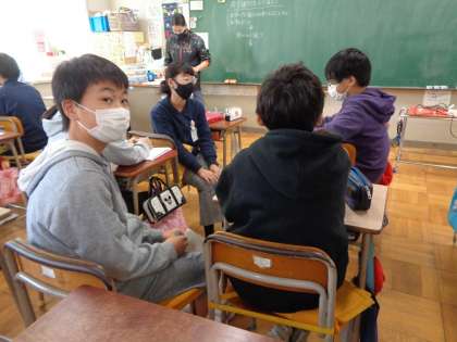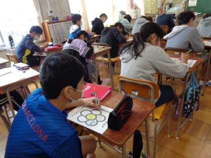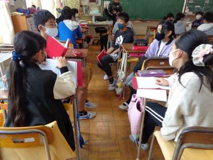 修学旅行で楽しかったこと、感じたことをなどをグループで話し合いました。その後、「ありがとうカード」にグループの友達に感謝したいことを書き込んでいました。