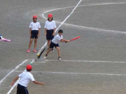 Tボールでボールを打ったりとったりする動きを高めています。