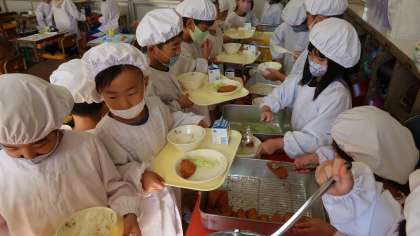 原ッピーは5年生作。写真は2年生の配膳の様子です。