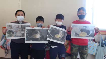 写真は5年生です。小麦粉とバターで、豆乳のシチューのルーを作っている給食室の写真を持っています。